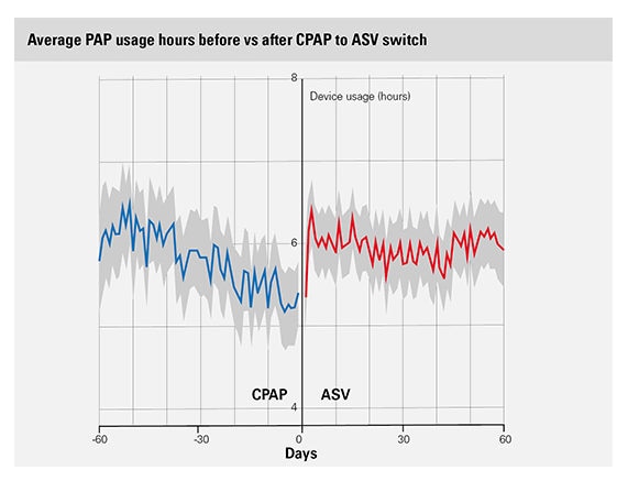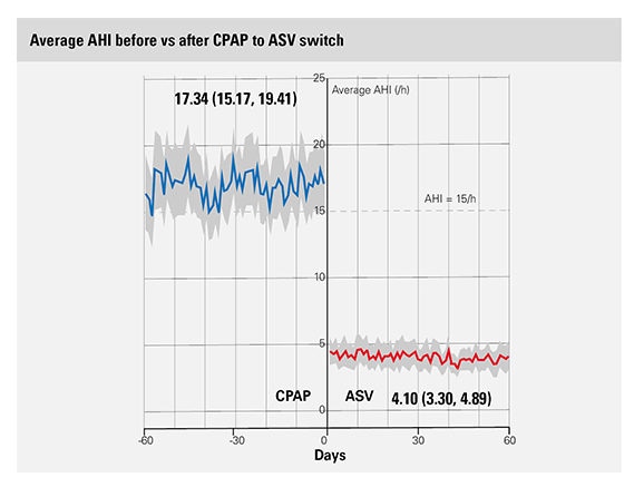A second analysis, performed on the same database, found that switching patients with persistent or emergent CSA from CPAP to ASV therapy* may improve compliance and could thus potentially improve patient outcomes.2