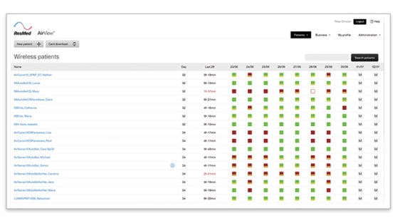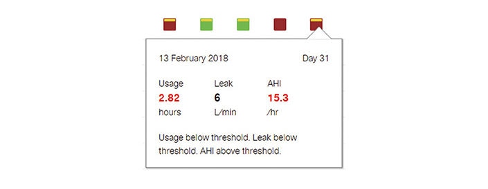 AirView‘s colour-coded wireless dashboard allows you to easily identify low usage and residual AHI. It provides an overview of the usage, AHI and leakage of the last 10 days. AirView icon guide is available here.