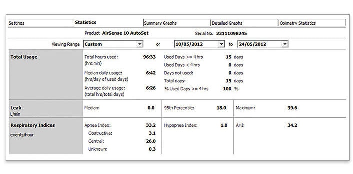 The statistical data of ResScan provide the AHI, AI, CAI, Hypopnea Index (HI) and Oxygen Desaturation Index (ODI) (if used with an oximeter), which allows you to identify residual CSA and Cheyne-Stokes respiration (CSR) during CPAP therapy.